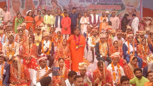 कानपुर देहात :जनपद के मूसानगर में केंद्रीय मंत्री के आश्रम में नंदिनी गौशाला की ओर से रविवार को 51 जोड़ों की शादी विधि विधान एवं धार्मिक अनुष्ठानों के साथ संपन्न हुई केंद्रीय मंत्री साध्वी निरंजन ज्योति उत्तर प्रदेश सरकार के कैबिनेट मंत्री राकेश सचान व दो विधायक जिसमें जहानाबाद और बिंदकी के उपस्थित रहे और वर वधू को आशीर्वाद दिया नंदिनी गौशाला की ओर से केंद्रीय मंत्री के आश्रम में 51 जोड़ों की शादी की गई सबसे पहले वर वधु ने एक दूसरे को माल्यार्पण किया जिस पर मंगल गीत गाए गए तथा लोगों ने हर्ष व्यक्त की कैबिनेट मंत्री राकेश सचान ने कहा कि इस तरह के आयोजन समाज में एक अच्छी दिशा देते हैं