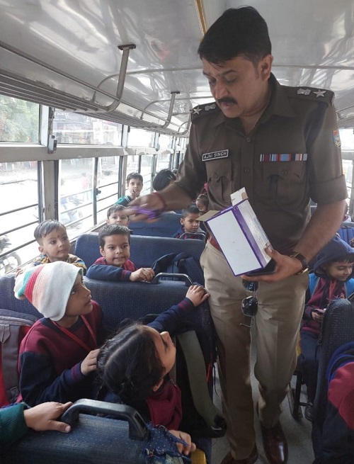 हरिद्वार :आज देहात क्षेत्र मंगलौर भ्रमण से वापस लौटते समय एसएसपी हरिद्वार श्री अजय सिंह के द्वारा सामने से आ रही स्कूली बस में अचानक अपना काफिला रुकवा कर बच्चों के बीच जा पहुंचे जहां पर उन्होंने बच्चों के साथ खुशनुमा पल बिताते हुए उनको चिल्ड्रन डे की शुभकामना दी वही स्कूली बस में मौजूद छोटे-छोटे बच्चे हरिद्वार एसएसपी को अपने बीच में पाकर आश्चर्यचकित हुए बच्चों को महोदय द्वारा चॉकलेट वितरण की गई वहीं एसएसपी हरिद्वार अजय सिंह के द्वारा छोटे बच्चों से हल्के-फुल्के अंदाज में कुछ सवाल भी पूछे गए तथा बच्चों के द्वारा सही जवाब देने वाले छात्रों को दो-दो चॉकलेट वितरित कर उनका उत्साहवर्धन किया गया चहल पहल के इस माहौल में बच्चों को भविष्य के सपनों को साकार करने के जरूरी टिप्स भी दिए हरिद्वार एसएसपी अजय सिंह के द्वारा पूर्व में भी बतौर एसपी सिटी देहरादून रहते हुए चिल्ड्रन डे पर ऐसे ही अचानक स्कूल के बच्चों से मुलाकात कर उनका हौसला अफजाई की गई थी !