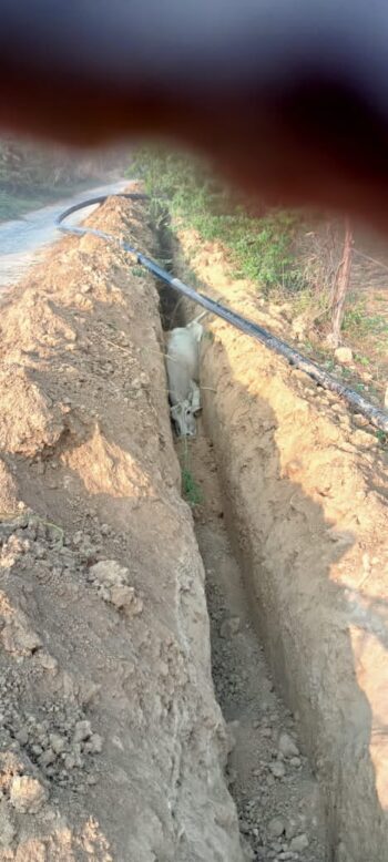 पेयजल पाइप लाइन बिछाने के लिए खोदी गई जगह जगह नाली लोगों के साथ साथ जानवरों के लिए मुसीबत बनती जा रही है। जिससे रात को ढिकियापुर में सड़क किनारे जेसीबी मशीन से खोदी गई नाली में एक छुट्टा गाय गिर कर फंस गई।जिसे गांव वालों ने रस्सी में बांधकर बाहर निकाला।