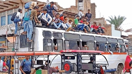 जान को खतरे में डालते हुए बिना किसी रोक टोक के बस की छत एवं जाल में लटककर यात्री कर रहे है सफर