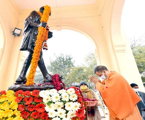 लखनऊ: मुख्यमंत्री योगी आदित्यनाथ ने सोमवार को राष्ट्रपिता महात्मा गांधी की पुण्यतिथि पर उन्हें श्रद्धांजलि दी। मुख्यमंत्री ने जीपीओ स्थित बापू की प्रतिमा पर पुष्पाजंलि अर्पित की। स्कूली बच्चों ने वैष्णव जन समेत कई भजन प्रस्तुत किए। राष्ट्र के कल्याण के लिए समर्पित रहे राष्ट्रपिता की पुण्यतिथि पर मुख्यमंत्री योगी आदित्यनाथ ने प्रतिमा के समक्ष कुछ देर बैठकर बच्चों के भजनों को भी सुना।