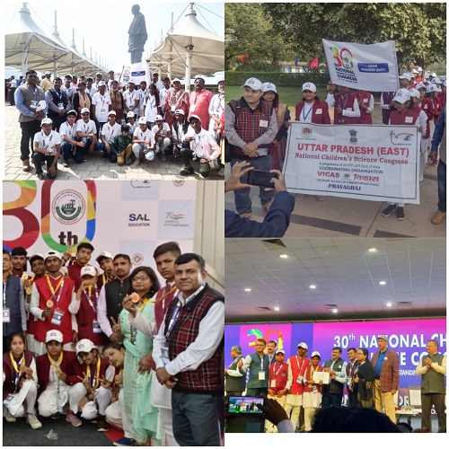 अंबेडकर नगर: डा. एस के सिंह के नेतृत्व में निरंजन लाल सहित 8 शिक्षकों व 20 बाल वैज्ञानिकों ने किया प्रतिभाग भारत सरकार के विज्ञान प्रौद्योगिकी विभाग एवं गुजरात काउन्सिल फ़ॉर साइन्स एवं टेक्नोलाजी (गुजकोस्ट) द्वारा आयोजित बाल विज्ञान कांग्रेस के राष्ट्रीय आयोजन में 28 राज्य 9 केन्द्र शासित प्रदेश व सउदीअरब, ओमान, कुवैत सहित 5 खाड़ी देशों के कुल 635 बाल वैज्ञानिक,शिक्षक, प्रतिष्ठित संस्थानों के वैज्ञानिक व विशेषज्ञ शामिल रहे। जिसमें पूर्वी उत्तर प्रदेश के राज्य समन्वयक व ‘विकास’ प्रयागराज के निदेशक डा. एस के सिंह के नेतृत्व में 20 बाल वैज्ञानिक व निरंजन लाल (टीम इन्चार्ज) डा. गरिमा यादव, सन्तोष कुमार पाण्डेय, विनिता सिंह, गोपाल कृष्ण गुप्ता,अर्पणा गुप्ता, ज्योति सोनी सहित 8 शिक्षक, गुजरात साइंस सिटी अहमदाबाद में 27 से 31 जनवरी को शामिल हुए।