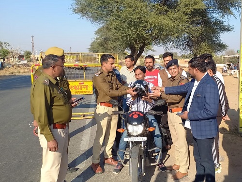 साथ ही हेलमेट पहनाकर समझाया।संस्था के अध्यक्ष मुकेश जायसवाल, प्रदीप गुप्त, अनिल औऱ नंदकुमार टोपी वाले ने दो पहिया वाहन चालकों को तिलक लगाकर हेलमेट पहनाया। अपील की गई कि केवल चालान से बचने के लिए हेलमेट न पहनें बल्कि अपने जीवन की सुरक्षा को देखते हुए इसका उपयोग करें। इस दौरान वाहन चालकों को सिर पर चोट लगने से होने वाली मौतों के आंकड़ों की भी जानकारी दी गई।