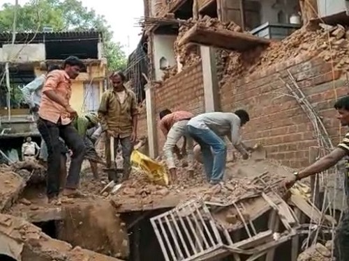 वाराणसी: चेतगंज क्षेत्र अंतर्गत बाग बरियार सिंह कॉलोनी में बुधवार दोपहर एक जर्जर मकान जमींदोज हो गया। घटना में दो मजदूर मलबे में दब गए।बागबरियार सिंह मोहल्ले में निर्माणाधीन मकान ढहने से एक मजदूर की मौत के बाद हड़कंप मचा हुआ था। इसी बीच मलबे से मरणासन्न हालत में एक और मजदूर को पुलिस कर्मचारी ने बाहर निकाला। मौके पर मौजूद चेतगंज थाने के दरोगा शशि प्रताप और अनंत मिश्रा ने मजदूर को बचाने की कोशिश में लग गए।