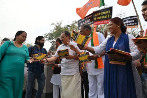 भाजपा ने मेट्रो स्टेशनों पर शराब घोटाले के विरुद्ध पत्रक बांट कर जन जागरण अभियान चलाया