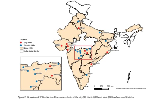सेंटर फॉर पॉलिसी रिसर्च की नई रिपोर्ट ‘भारत हीटवेव के प्रति कैसे अनुकूल हो रहा है?: परिवर्तनकारी जलवायु कार्रवाई हेतु निरीक्षण के साथ हीट एक्शन प्लान का आकलन’। यह शोध 18 राज्यों में 37 एचएपी (HAP) का आकलन करता है ताकि यह समझा जा सके कि देश असामान्य गर्मी (हीटवेव) से निपटने के लिए कितना तैयार है। हमारे आकलन में कवर किए गए राज्यों, शहरों और जिलों की सूची यहाँ है: