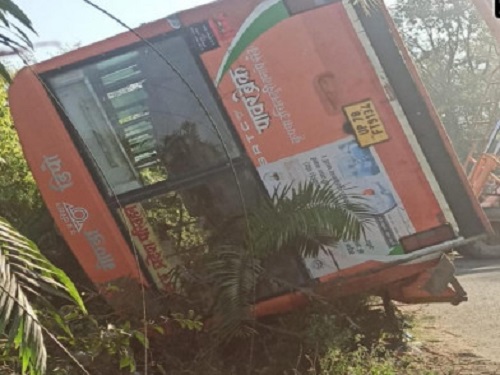 मंडी समिति के पास बस अनियंत्रित होकर पलट गई। बस पलटने से हाईवे पर अफरा-तफरी मच गई। बस में सवार लोग नीचे दब गए। घटना के बाद मौके पर बड़ी संख्या में लोग जुट गए। उन्होंने बस में फंसे लोगों को बाहर निकाला।सूचना पर पुलिस पहुंच गई। करीब छह घायलों को नजदीक के अस्पताल में भर्ती कराया गया है। 12 से 15 घायल प्राथमिक उपचार कराने के बाद चले गए। पुलिस के अनुसार ऑवरटेक करने की वजह से हादसा हुआ।