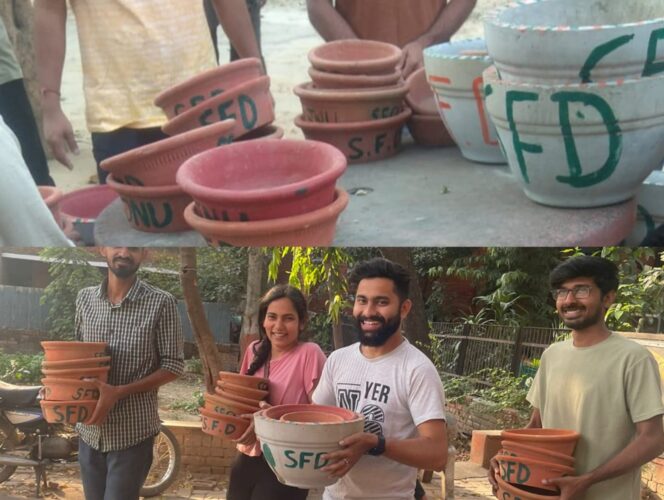 एसएफडी ने जेएनयू में परिसर में पक्षियों के लिए सकोरे रखने की मुहीम चला कर पथ्वी दिवस की शुरुवात की