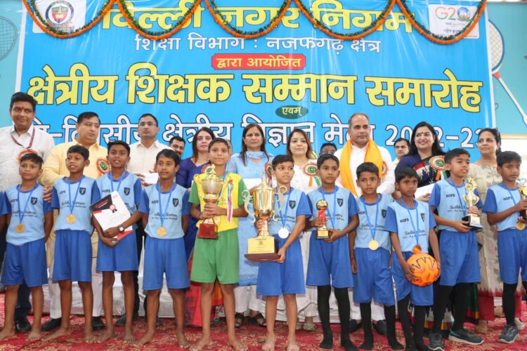 नई दिल्ली: द्वारका स्थित ‘एमसीडी प्राइमरी गर्ल्स स्कूल पोचनपुर’ में तीन दिवसीय वार्षिक विज्ञान मेले और शिक्षक सम्मान समारोह का आयोजन किया गया। मेयर शैली ओबेरॉय ने नजफगढ़ जोन के विज्ञान मेले का उद्घाटन किया और स्कूलों के शिक्षकों को सम्मानित किया। इस समारोह में दिल्ली नगर निगम नजफगढ़ जोन के 05 स्कूलों को ‘सर्वश्रेष्ठ स्कूल’, 15 शिक्षकों को ‘सर्वश्रेष्ठ कर्मचारी’ एवं 04 चतुर्थ श्रेणी कर्मचारियों को ‘सर्वश्रेष्ठ कर्मचारी’ का पुरस्कार प्रदान किया गया।