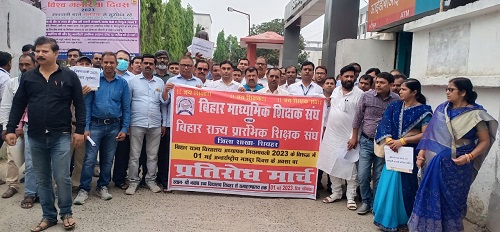 बिहार राज्य अध्यापक नियमावली 2023 में संशोधन करते हुए राज्य के शिक्षा एवं शिक्षक हित में पंचायती राज एवं नगर निकाय संस्था अंतर्गत पूर्व से नियुक्त सभी नियोजित शिक्षकों को बिना शर्त राज्यकर्मी के रूप में समायोजित करते हुए पूर्ण वेतनमान व पुरानी पेंशन लागू करे अन्यथा चरणबद्ध आंदोलन किया जाएगा।मौके पर चंदेश्वर कुमार,हिमांशु प्रियदर्शी, मनोज कुमार, राहुल कुमार, लाल बिहारी, तुफैल अंसारी,बिरेंद्र बैठा,हेमनारायण, शिवनाथ साह, रविन्द्र मांझी, उमाशंकर सिंह, वासूदेव,अशरफ अली, धर्मेंद्र कुमार, बजरंगी साह, आलोक कुमार, राजेश कुमार, उमेश कुमार बैठा, वीरेश्वर सिंह, राजीव कुमार,ललन कुमार, रूपेश कुमार,पप्पू कुमार सिंह, कृष्ण मुरारी, सुरेश कुमार, मोहम्मद कमरे आलम, जयशंकर प्रसाद, अनामिका निधि,विभा कुमारी, राधेश्याम पासवान, बिरेंद्र कुमार सुमन सहित सैकड़ों शिक्षक व शिक्षिकाऐं मौजूद थे।