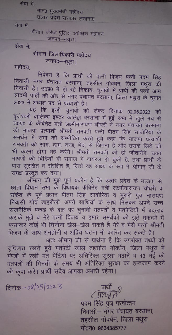 नगर पंचायत बरसाना से अध्यक्ष पद के लिए आम आदमी पार्टी की प्रत्याशी विजय के पति पदम सिंह ने एसएसपी और जिलाधिकारी को ज्ञापन सौंपा है। एक प्रति मुख्यमंत्री को भी संबोधित है। अपने शिकायती पत्र में पदम सिंह ने बताया कि 2 मई को बृजेश्वरी बालिका इंटर कॉलेज बरसाना में हुई सभा में खुले मंच से उत्तर प्रदेश के कैबिनेट मंत्री लक्ष्मीनारायण चौधरी ने नगर पंचायत बरसाना की भाजपा प्रत्याशी श्रीमती रामवती पत्नी पीतम सिंह साबोरिया के समर्थन में सभा को संबोधित करते हुए कहा के भाजपा प्रत्याशी रामवती को साम दाम दंड भेद से जिताना है। उसके लिए जो भी होगा वह करेंगे। श्रीमती रामवती को ही जिताएंगे।