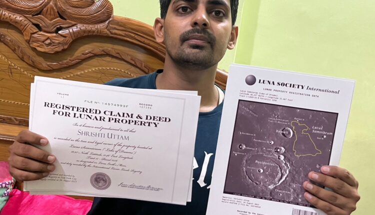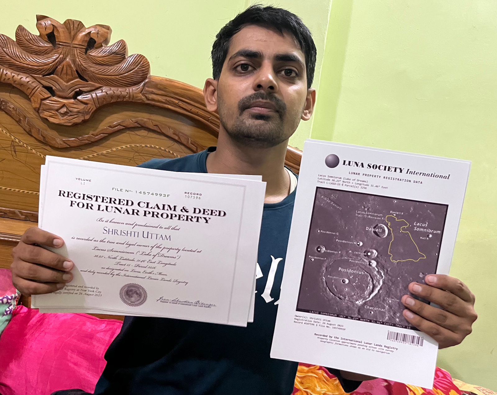 फतेहपुर। जनपद के अमौली कस्बा के शिवम उमराव ने लूना सोसाइटी की वेबसाइट से चांद पर एक एकड़ जमीन खरीदी है।शिवम उमराव की माता ने चंद्रमुखी का कहना है कि उन्होंने अपने होने वाली बहू सृष्टि उत्तम के लिए कुछ नया करने को सोचा था। इसलिए उन्होंने सोचा कि लोग शहर और देश विदेश मे जमीन लेते है गिप्ट करते हैं तो मै क्यो न अपने होने वाली बहू के लिए चाँद पर क्यो न जमीन लूँ। कुछ अलग व कुछ अनोखा गिप्ट दूँ। चंद्रमुखी का कहना है कि गिप्ट का कोई मूल्य नही होता है। बता दे कि सृष्टि उत्तम को चांद पर जमीन खरीदने के साथ ही उन्हें चांद की नागरिकता भी मिल गई है। इसके साथ ही जमीन के दस्तावेजों के साथ उन्हें कई अधिकार भी दिए गए हैं।शिवम उमराव ने बताया कि चांद की नागरिकता उन्हें लूना सोसायटी की ओर से दी गई है। उल्लेखनीय है कि शिवम उमराव ने लगभग दो महीने पहले लूना सोसाइटी की वेबसाइट से चांद पर जमीन खरीदने के लिए रजिस्ट्रेशन कराया था।चांद पर जमीन खरीदने वाले शिवम उमराव फ़तेहपुर जनपद थाना चांदपुर क्षेत्र के अमौली कस्बा का रहने वाला है माता चंद्रमुखी जो पूर्व एनम सामुदायिक स्वास्थ्य केन्द्र अमौली काम करती थी। चंद्रमुखी ने बताया कि उसने एक्टर सुशांत सिंह राजपूत सुसाइड केस के दौरान चांद पर जमीन खरीदने की खबर टेलीविजन पर देखी थी, जिसमें यह दिखाया जा रहा था कि फ़िल्म अभिनेता सुशांत सिंह राजपूत ने चांद पर जमीन खरीद रखी है। टेलीविजन पर इस खबर को देखने के बाद उसमें भी चांद पर जमीन खरीदने के लिए जिज्ञासा बढ़ी। इसके लिए उसने लूना सोसाइटी की वेबसाइट पर ऑनलाइन आवेदन किया।गुरुवार को सोसायटी की ओर से उन्हें प्रॉपर्टी के कागजात उपलब्ध कराए गए। सोसायटी की ओर से बोर्डिंग पास और टिकट भी उपलब्ध कराए गए है। शिवम ने बताया कि भविष्य में अगर वहां जाना होगा तो वे जरूर जाएंगे, क्योंकि चांद पर बहुत कम लोग गए।