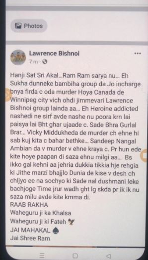 गैंगस्टर लॉरेन्स बिश्नोई गैंग ने पीनीपेग सिटी में भारत से फरार गैंगस्टर सुखदूल सिंह उर्फ सुक्खा दुनुके की हत्या की जिम्मेदारी ली है. लारेंस बिश्नोई के एक फेसबुक प्रोफाइल से पोस्ट की गई है जिसमें कनाडा में हुई हत्या की जिम्मेदारी ली गई है. इसके साथ ही इस पोस्ट में और गैंगस्टरों की भी धमकी दी गई है कि वो जहां मर्जी भाग लें, उन्हें पापों की सजा जरूर मिलेगी. इस फेसबुक पोस्ट में कहा गया है, ‘हां जी सत श्री कॉल, राम राम.ये सुक्खा दुनिके के बंबिहा ग्रुप का जो इंचार्ज बना फिरता था उसका मर्डर हुआ है कनाडा के विनिपेग सिटी में. उसकी जिम्मेदारी लारेंस बिश्नोई ग्रुप लेता है. इस ड्रग एडिक्टेड नशेड़ी और सिर्फ अपने नशे को पूरा करने के लिए पैसों के लिए उसने बहुत घर उजाड़े थे. हमारे भाई गुरलाल बराड़, विक्की मिद्दुखेड़ा के मर्डर में इसने बाहर बैठकर सबकुछ किया. संदीप नंगल अंबिया का मर्डर भी इसने करवाया था पर अब इसके किए हुए पापों की सजा उसे मिल गई है. बस एक बात कहनी है जो दुक्कियां टिक्कियां अभी भी रह गई हैं जहां मर्जी भाग लो, दुनिया में किसी भी देश में चले जाओ. मत सोचो हमारे साथ दुश्मनी लेकर बचोगे, टाइम जरूर कम ज्यादा लग सकता है.लेकिन सजा सबको मिलेगी.’ आपको बता दें कि पंजाब से फरार होकर कनाडा में बैठे A कैटगरी के गैंगस्टर सुखदूल सिंह उर्फ सुक्खा दुनुके की गुरुवार को कनाडा में गोली मारकर हत्या कर दी गई थी. आरोपी सुक्खा खालिस्तानी आतंकी अर्शदीप सिंह उर्फ अर्श डाला का राइट हैंड था और एनआईए की वॉटेंड लिस्ट में शामिल था.