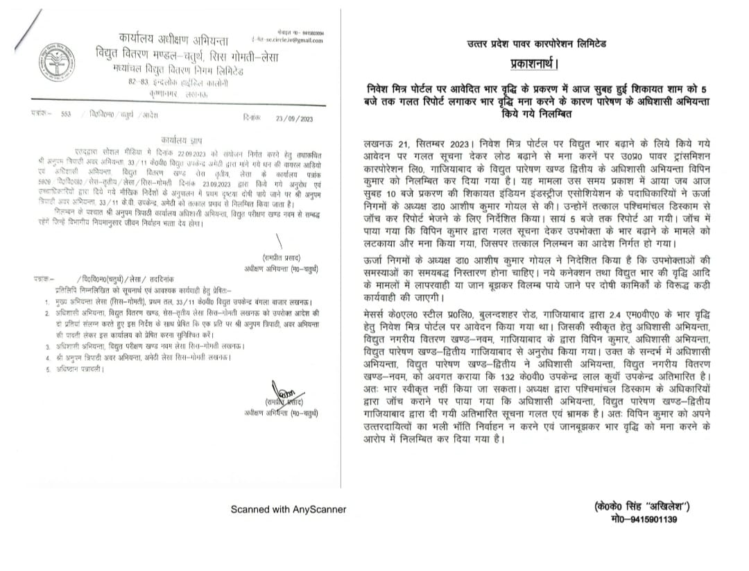– जिसमें एक तरफ़ ग़ाज़ियाबाद के अधिशासी अभियंता को ग़लत कारणों से लोड न बढ़ाने तथा इसमें हीला-हवाली करने के लिए निलंबित किया गया।