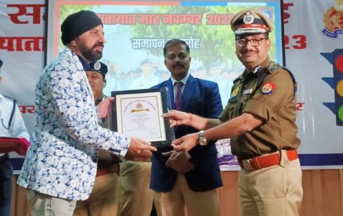 यातायात माह नवम्बर 2023 समापन समारोह के अवसर पर मर्चेन्ट चैम्बर हॉल में मुख्य अतिथि अपर पुलिस महानिदेशक कानपुर जोन आलोक सिंह का पुलिस आयुक्त डॉ0आर0के0 स्वर्णकार ने स्वागत किया।इस मौके पर JCP L/O आनन्द प्रकाश तिवारी व डीसीपी पश्चिम विजय ढुल ,डीसीपी पूर्वी तेजस्वरूप, डीसीपी सेन्ट्रल प्रमोद कुमार ,अपर पुलिस उपायुक्त ट्रैफिक अंकिता शर्मा सहित अन्य अधिकारीगण उपस्थित रहे। इस मौके पर KDMA के छात्र-छात्राओं द्वारा नुक्कड़ नाटक की प्रस्तुति की गई। प्रस्तुति के पश्चात सभी को हेलमेट व सीट बेल्ट लगाने की शपथ दिलाई गई। KDMA के छात्र-छात्राओं एवं ट्रैफिक वॉलंटियर्स व स्कूल प्रबन्धक, मुख्य अतिथि अपर पुलिस महानिदेशक कानपुर जोन आलोक सिंह व पुलिस आयुक्त डॉ0 आर. के. स्वर्णकार महोदय द्वारा सम्मानित किया गया