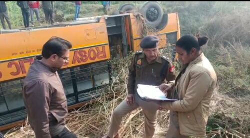 स्कूल बस अनियंत्रित होकर पलटी 37 बच्चे थे सवार दो के आईं चोटें