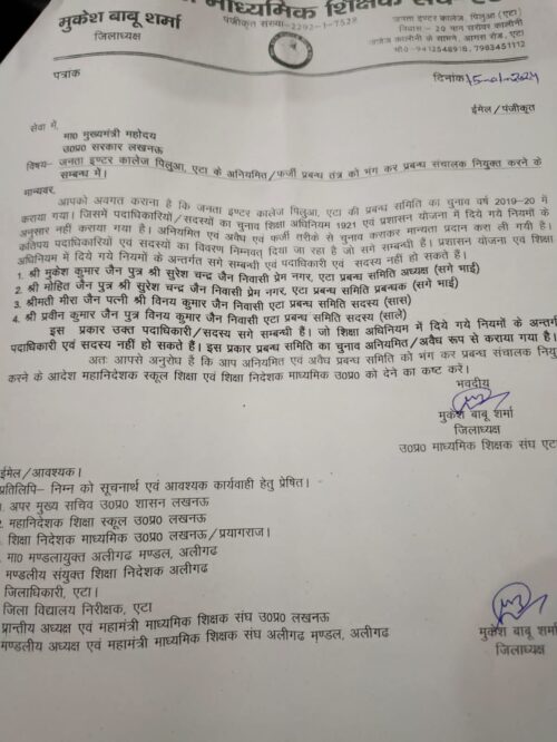जनता इंटर कॉलेज पिलुआ के प्रबंध तंत्र पर लग रहे गंभीर आरोपों के बीच फर्जी प्रबन्ध तंत्र को भंग कर प्रबंध संचालक की नियुक्त की मांग