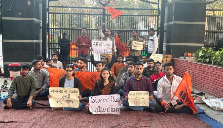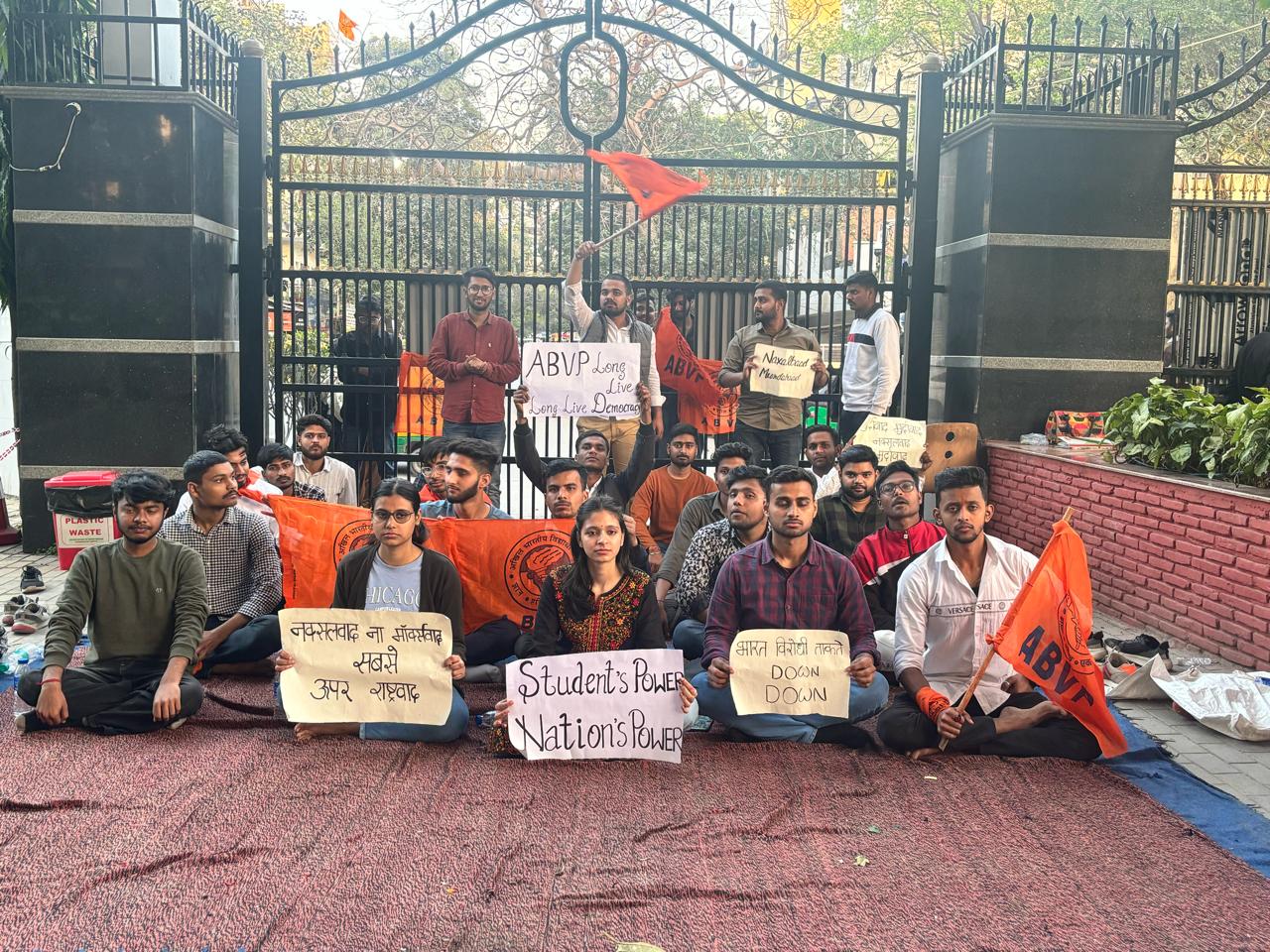 शहीद भगत सिंह कॉलेज के सहायक प्राध्यापक विरुद्ध सख़्त कार्रवाई करने को लेकर धरने पर बैठे एबीवीपी के कार्यकर्ता