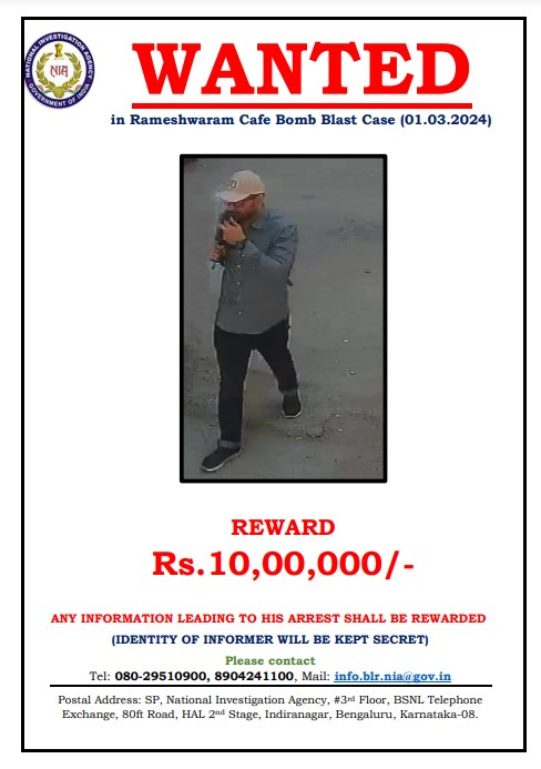 नई दिल्ली: कर्नाटक की राजधानी बेंगलुरु में कुछ दिन पहले रामेश्वरम कैफे में धमाका करने वाले संदिग्ध व्यक्ति का राष्ट्रीय जांच एजेंसी ने पोस्टर जारी किया है। एनआईए के पोस्टर में संदिग्ध पैंट, कमीज और टोपी पहने दिख रहा है। उसके कंधे पर बैग है। जांच एजेंसी ने पोस्टर जारी कर कहा कि हमलावर की जानकारी देने वाले को 10 लाख रुपये का इनाम दिया जाएगा। इसके साथ ही जानकारी देने वाले की पहचान गुप्त रखी जाएगी।