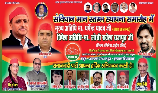 मथुरा। संविधान मान स्तंभ स्थापना समारोह के कार्यक्रम में दिनांक 08/09/2024 को गोवर्धन रोड स्थित खंडेलवाल सेवा सदन में प्रातः 11:00 बजे समाजवादी पार्टी के मुख्य स्तंभ एवं मुख्य अतिथि मा० धर्मेन्द्र यादव वर्तमान सांसद आजमगढ़ व विशिष्ट अतिथि के तौर पर राष्ट्रीय सचिव लोधी राकेश राजपूत( फिल्म अभिनेता) व जनपद मथुरा के समाजवादी पार्टी के जुझारू कार्यकर्ता रितु गोयल मथुरा वृंदावन महानगर अध्यक्ष ,डॉ राजेंद्र प्रसाद लोधी 84 मथुरा वृंदावन विधान सभा अध्यक्ष, सतीश पटेल सपा नेता ,मानसिंह पटेल ,बाबू सिंह लोधी जिला महामंत्री अखिल भारतीय लोधी महासभा ,राजेंद्र लोधी, रवि लोधी ,ओमपाल सैनी, राकेश सैनी पूर्व जिला सचिव , एवं समाजवादी पार्टी के तमाम कार्यकर्ता इस कार्यक्रम में शामिल हो रहे हैं।