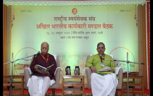 मथुरा। राष्ट्रीय स्वयंसेवक संघ की वार्षिक अखिल भारतीय कार्यकारी मण्डल की दो दिवसीय बैठक का शुभारंभ शुक्रवार (25 अक्टूबर) को दीनदयाल गौ विज्ञान अनुसंधान एवं प्रशिक्षण केंद्र, गऊ ग्राम, परखम, फरह के नवधा सभागार में राष्ट्रीय स्वयंसेवक संघ के पूजनीय सरसंघचालक डॉ. मोहन जी भागवत एवं माननीय सरकार्यवाह दत्तात्रेय होसबाले जी के द्वारा भारत माता के चित्र पर पुष्पार्चन अर्पित कर किया गया। बैठक के प्रारम्भ में हाल ही में दिवंगत हुए पूज्य राघवाचार्य महाराज (जयपुर), प्रसिद्ध उद्योगपति पद्मविभूषण रतन टाटा, पश्चिम बंगाल के पूर्व मुख्यमंत्री श्री बुद्धदेव भट्टाचार्य, ईनाडु और रामोजी फ़िल्म सिटी के संस्थापक श्री रामोज़ी राव, कम्युनिस्ट नेता सीताराम येचुरी, पूर्व विदेश मन्त्री के. नटवर सिंह, बिहार के पूर्व उपमुख्यमंत्री श्री सुशील मोदी, एडमिरल (सेनि) रामदास तथा दिवंगत अन्य प्रमुख लोगों को श्रद्धांजलि अर्पित की गई। बैठक के प्रारंभ में मार्च 2024 की अ. भा. प्रतिनिधि सभा की बैठक की कार्यवाही का अनुमोदन किया गया।