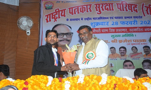28-02-2025- (शुक्रवार) लखनऊ के सहकारिता भवन में आज राष्ट्रीय पत्रकार सुरक्षा परिषद का राष्ट्रीय अधिवेशन धूमधाम से सम्पन्न हुआ। कार्यक्रम के मुख्य अतिथि प्रदेश के उप मुख्यमंत्री बृजेश पाठक रहे। कार्यक्रम में पत्रकारों को सम्मानित किया गया।