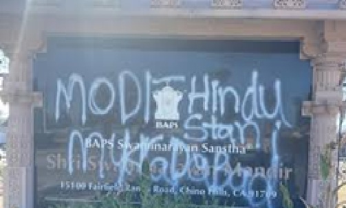 शनिवार को चीनो हिल्स स्थित बोचासनवासी अक्षर पुरुषोत्तम स्वामीनारायण संस्था (बीएपीएस) के मंदिर में अज्ञात लोगों ने द्वारा तोड़फोड़ की गयी है। मीडिया रिपोर्ट्स के मुताबिक, मंदिर की दीवारों पर ‘हिंदू वापस जाओ’ और ‘मोदी हिंदूस्तान मुरदाबाद’ जैसे नारे लिखे गए थे।