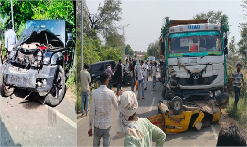 उत्तर प्रदेश के मथुरा जिले के जैत थाना क्षेत्र में रामताल वृंदावन रोड पर शनिवार शाम एक सड़क हादसे में एक ही परिवार के तीन सगे भाइयों और चालक समेत चार लोगों की मौत हो गई जबकि एक अन्य गंभीर रूप से घायल हो गया।पुलिस ने यह जानकारी दी। पुलिस के अनुसार एक तेज रफ्तार कार ने सवारी ऑटो को टक्कर मार दी, जिससे वह पलट गया और इसके बाद सड़क पर घायल पड़े लोगों को पीछे से आ रहे डंपर ने कुचल दिया।पुलिस के मुताबिक ऑटो चालक के अलावा तीन भाइयों की मौके पर ही मौत हो गयी तथा उनका चचेरा भाई गंभीर रूप से घायल हो गया। उसे अस्पताल में भर्ती कराया गया है, जहां चिकित्सक उसकी जान बचाने के भरसक प्रयास खर रहे हैं। सभी भाई मप्र के इंदौर से एक शादी समारोह में शामिल होनेवृन्दावन पहुंचे थे।पुलिस अधीक्षक (शहर) आरविंद कुमार ने बताया कि गोविंद नगर क्षेत्र के जयसिंहपुरा खादर का निवासी आटो-रिक्शा चालक साबिर (25) तथा इंदौर निवासी सगे भाइयों प्यारे लाल शर्मा (60), हुकुम चंद शर्मा (40) व मुकेश शर्मा (45) तथा उनके चचेरे भाई शिवम शर्मा को प्रेम मंदिर के दर्शन कराकर वापस होटल छोड़ने ले जा रहा था। तभी यह हादसा हुआ और चालक के अलावा तीनों सगे भाइयों की मौत हो गयी।टक्कर इतनी भीषण थी कि आटो रिक्शा के टुकड़े सौ मीटर के दायरे मैं फैल गए तथा चालक सहित पांचों सवार भी सड़क पर गिर गए, जिन्हें पीछे से आ रहे एक डंपर ने कुचल दिया।दुर्घटना होते ही कार और डंपर चालक अपने वाहन मौके पर ही छोड़कर फरार हो गए। उन्होंने बताया कि शवों को पोस्टमार्टम के लिए भेजकर परिजनों को सूचित कर दिया गया है। जिलाधिकारी चंद्र प्रकाश सिंह ने बताया कि हादसे में मारे लोगों के आश्रितों को हरसंभल आर्थिक सहायता मुहैया कराई जाएगी।