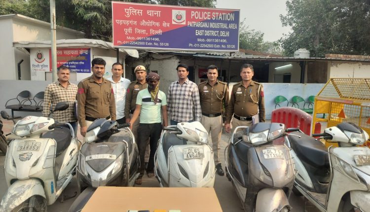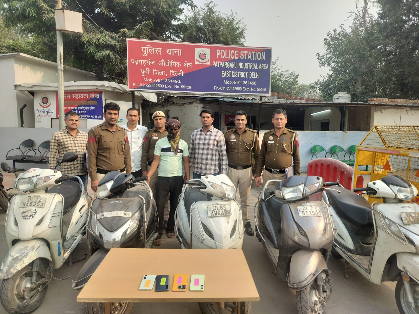 नई दिल्ली: दिल्ली के पटपड़गंज इंडस्ट्रियल एरिया थाना पुलिस ने सड़क अपराध पर अंकुश लगाने के लिए चलाए जा रहे विशेष अभियान में बड़ी सफलता हासिल की है। पुलिस ने EDM मॉल के पास एक शातिर झपटमार को रंगे हाथों गिरफ्तार कर लिया। आरोपी के पास से 5 चोरी की होंडा एक्टिवा स्कूटी और 4 छीने हुए मोबाइल फोन बरामद किए गए हैं।