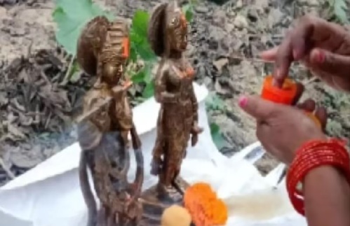 उन्नाव: उत्तर प्रदेश के उन्नाव जिले में खोदाई के दौरान राधा-कृष्ण की मूर्ति मिली। उसके पास में ही एक सांप बैठा था, जो मूर्ति की रक्षा कर रहा था। इसके अलावा पास में ही एक प्राचीन भोजपत्र भी था। मूर्ति मिलने के कुछ देर बार सांप की मौत हो गई। वहीं, जिस किसान की मूर्ति मिली, उसकी भी तबीयत खराब हो गई है। मामला माखी क्षेत्र के मिर्जापुर कला गांव का है।मिर्जापुर कला गांव के खेत में मेड किनारे झाड़ियों का हटाकर किसान खोदाई कर रहा था, तभी राधा-कृष्ण की एक मूर्ति मिली। उसके पास में ही भोजपक्ष और घड़ा मिला। खोदाई के दौरान फावड़ा लगने से सांप घायल हो गया, जिससे उसकी कुछ देर बाद मौत हो गई। वहीं, मूर्ति मिलने के बाद किसान की तबीयत बिगड़ गई। किसान को अस्पताल में भर्ती कराया गया है। जिला पर्यटन अधिकारी के अनुसार, मूर्तियों का वजन लगभग दो किलो है और तांबे की है। इसकी रिपोर्ट एसडीएम को भेज दी गई है। वहीं, पत्र को उत्तर प्रदेश राज्य पुरातत्व निदेशालय को भेजा जा रहा है। वहां से आने वाली टीम इस पर लिखी भाषा और मूर्तियों की प्राचीनता के बारे में जांच करेगी कि कितनी पुरानी मूर्ति है और भोजपत्र पर क्या है। साथ ही यह कौन सी भाषा है।खोदाई में राधा-कृष्ण की मूर्ति की जानकारी जैसे ही ग्रामीणों को हुई तो वहां भीड़ लग गई। लोगों ने जहां पर मूर्ति मिली है, वहां पर मंदिर निर्माण की मांग कर रहे हैं। पुलिस का कहना है कि मामले की जानकारी मिली है। जांच की जा रही है। अभी मूर्तियां किसान की सुरक्षा में रहेंगी।