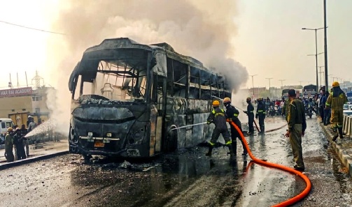 कानपुर में चलती बस में लगी आग; पुलिसकर्मियों ने 35 यात्रियों की बचाई जान, हाईवे पर लंबा जाम