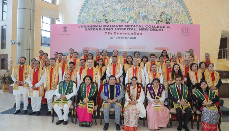 नई दिल्ली: वर्धमान महावीर मेडिकल कॉलेज (वीएमएमसी) एवं सफदरजंग अस्पताल का सातवां दीक्षांत समारोह 22 दिसंबर 2025 को दिल्ली कैंटोनमेंट स्थित मानेकशॉ सेंटर के जोरावर ऑडिटोरियम में धूमधाम से संपन्न हुआ। समारोह में स्नातक, स्नातकोत्तर और सुपर-स्पेशियलिटी छात्रों की शैक्षणिक उपलब्धियों का जश्न मनाया गया। समारोह में कुल 217 से अधिक स्नातकोत्तर, 136 स्नातक और 40 सुपर-स्पेशियलिटी छात्रों को डिग्री प्रदान की गई। साथ ही उत्कृष्ट प्रदर्शन के लिए 43 मेडल भी वितरित किए गए।