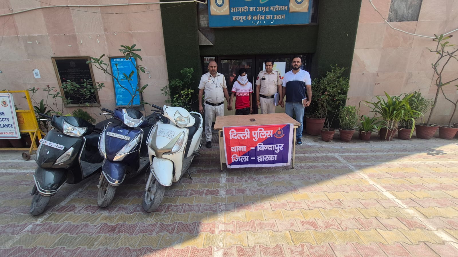 नई दिल्ली: दिल्ली पुलिस के द्वारका जिला की बिंदापुर थाना टीम ने वाहन चोरी के खिलाफ जीरो टॉलरेंस नीति के तहत कार्रवाई करते हुए एक सक्रिय अपराधी को गिरफ्तार किया है। पकड़े गए आरोपी की पहचान अली हुसैन उर्फ लल्ले (24 वर्ष), निवासी भगवती विहार, बिंदापुर के रूप में हुई है। पुलिस ने आरोपी के कब्जे और उसकी निशानदेही पर तीन चोरी की स्कूटी और एक चोरी का मोबाइल फोन बरामद किया है। आरोपी अली हुसैन एक आदतन अपराधी है, जो पहले भी चोरी और स्नैचिंग के नौ से अधिक आपराधिक मामलों में शामिल रहा है।