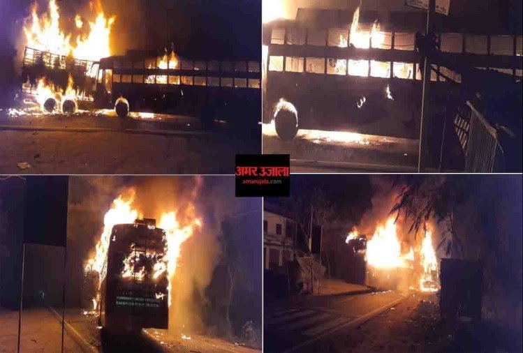 आग की लपटें देख बस में बैठे यात्रियों में बाहर निकलने को लेकर हंगामा मच गया।