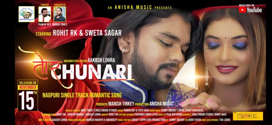 राँची। झॉलीवुड जगत के सुपरस्टार अभिनेता रोहित आरके अपने कई हिट नागपुरी वीडियो गानों के बाद आकाश लोहरा के साथ एक नई प्रस्तुति पेश करने वालें हैं।दी लुक्स प्रोफेशनल्स राँची द्वारा स्पोन्सर्ड नागपुरी वीडियो गाना तोर चुनरी झारखण्ड स्थापना दिवस 15 नवम्बर को अनीशा म्यूजिक यूट्यूब चैनल पर रिलीज की जायेगी।कलाकारों से मिली जानकरी के अनुसार गानें की शूटिंग सिक्किम चीन सीमा,देलो बंग्लो,ट्रीटस नदी और नॉर्थ बंगाल डुअर्स में की गयी हैं।इस गानें में रोहित आरके के साथ स्वेता सागर अभिनय करती नजर आयेंगी।
