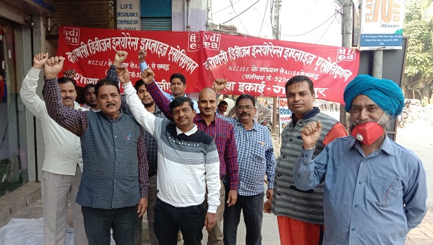 गाजीपुर। । ऑल इंडिया इन्श्योरेंस इम्प्लाइज एसोसिएशन के तत्वावधान के आह्वान पर आज गाज़ीपुर शाखा में आईपीओ श्रमिक विरोधी नीति, वेतन पुनरीक्षण, चतुर्थ श्रेणी की भर्ती एवं न्यूनतम वेतन मान 21000 प्रतिमाह करने हेतुएक दिवसीय हड़ताल पर है।बता दें कि आज हमारे सभी भारतीय जीवन बीमा निगम के कर्मचारी अधिकारी सरकार की श्रम नीति के विरोध में धरना प्रदर्शन कर अपनी विभिन्न प्रकार की मांगों को संगठन के माध्यम से मांग कर रहे हैं। जिसमें शशिकांत पांडे संतोष कुमार सिंह अरविंद कुमार राय मदन राम सुजीत सिंह पवन सिंह अनंत अनंत प्रसाद चौरसिया ओमप्रकाश साक्षी अरुण यादव मीरा तिवारी ममता बबीता मोहित मिश्रा कुमार सुदर्शन जोगिंदर यादव राम अवतार राम अविनाश अखिलेश्वर यादव सौरभ संजय तिवारी संजय विश्वकर्मा हरिवंश सिंह एवं सभी कामरेड साथी उपस्थित थे।