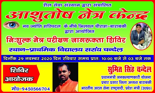 राष्ट्रीय जजमेंट बाराबंकी हैदरगढ़ ग्राम पंचायत सरांय चन्देल निवासी समाजसेवी सुमित सिंह प्रदेश मंत्री के द्वारा 29 नवम्बर 2020 को नि:शुल्क नेत्र शिविर का आयोजन प्राथमिक विद्यालय सरांय चन्देल में किया जायेगा यहां मरीजोें का नि:शुल्क इलाज होगा।