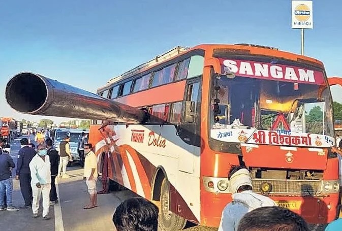100 फिट लंबा पाइप हवा में लहराता हुआ निजी ट्रैवल्स बस में घुसा, महिला का सिर धड़ से हुआ अलग, 13 घायल
