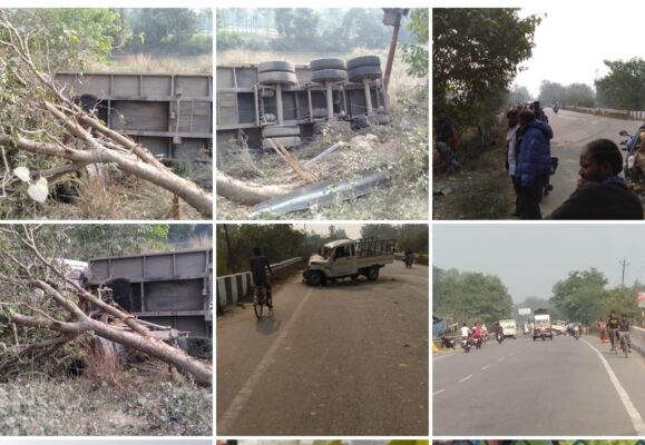 मेडिकल कालेज के पास अनियंत्रित ट्रक और पिकअप की भीषण टक्कर, ट्रक खाई मे पलटा
