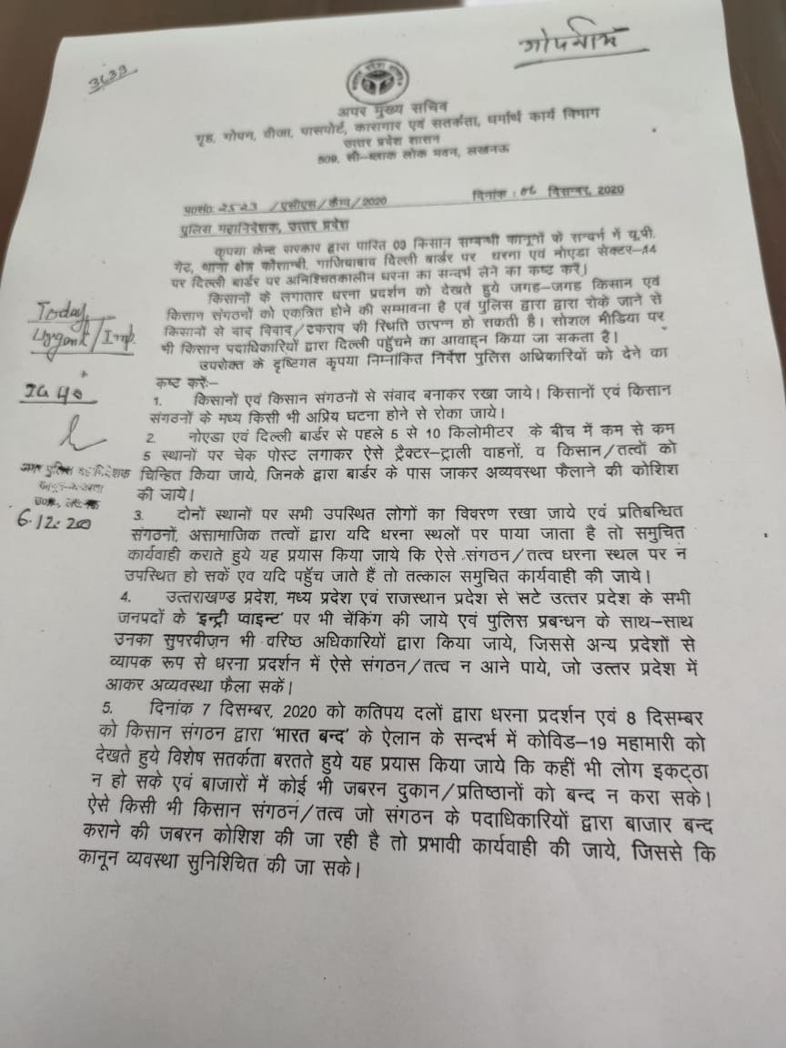 सोमवार को अपर मुख्य सचिव गृह अवनीश अवस्थी ने डीजीपी हितेश चंद्र अवस्थी को पत्र लिखकर कहा है कि वे पुलिस अधिकारियों को निर्देश दें कि गाजियाबाद और नोएडा में किसानों के प्रदर्शन में शामिल लोगों का विवरण रखें।