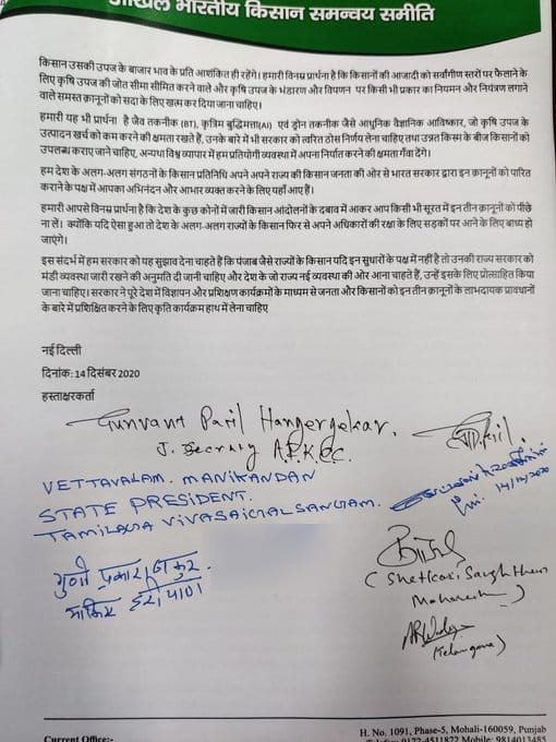 नरेंद्र सिंह तोमर ने कहा, ‘आज महाराष्ट्र, उत्तर प्रदेश, तमिलनाडु, तेलंगाना, बिहार, केरल और हरियाणा से आए 10 किसान संगठनों ने ऑल इंडिया किसान कॉर्डिनेशन कमेटी के तहत दिल्ली पहुंचकर सरकार को कृषि कानूनों पर अपना समर्थन पत्र सौंपा है। किसान संगठनों के नेताओं ने कहा कि मोदी सरकार किसानों के हित में ये तीनों कृषि कानून लेकर आई है इसलिए वो इसका स्वागत और समर्थन करते हैं।’