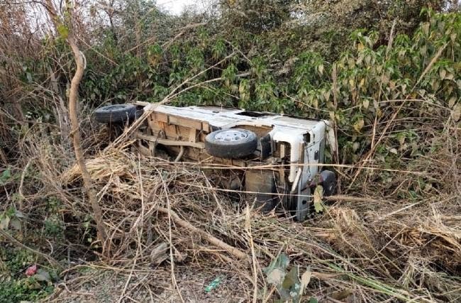 बाइक सवार को टक्कर मारकर गड्ढे में पलटी बोलेरो, तीन घायल