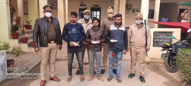 अलीगढ़ : मडराक थानाध्यक्ष राजीव कुमार सिंघम पुलिस पार्टी केसाथ  चेकिंग  कर रहे थे तभी एक संदिग्ध वाहन की चेकिंग के दोरान  गैंगस्टर एक्ट के वांछित तीन नफर अभियुक्त गण मय तमंचा कारतूस व चाकू के  मिल गए उन को पुलिस ने गिरफ्तार कर लिया  और थाने ला कर जेल भेज दिया