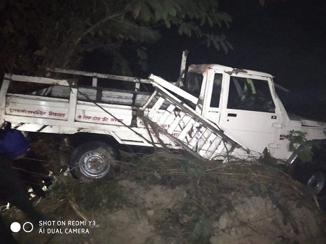 चालक व एक अन्य ने पिकअप से कूदकर बचाई जान।