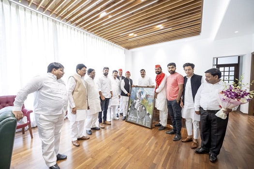 नीरज शाही एडवोकेट ने समाजवादी पार्टी के राष्ट्रीय अध्यक्ष एवं पूर्व मुख्यमंत्री अखिलेश यादव जी को महाराजा राणा प्रताप का शौर्य चित्र, संतोष कृष्ण त्रिपाठी ने ‘‘बाइस में बाइसिकल‘‘ संकल्प का संदेश देती साइकिल चलाते पेंटिंग भेंट की।इस अवसर पर गोरखपुर के जफर अमीन ‘डक्कू‘ तथा सुनील सिंह की उपस्थिति उल्लेखनीय रही।