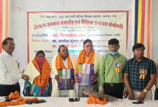 उक्त बातें उत्तर प्रदेशीय अनु.जाति/जनजाति बेसिक शिक्षक महासंघ उ.प्र. मऊ वाणी कोट, भीटी में आयोजित सेवानिवृत्त शिक्षक सम्मान समारोह एवं शैक्षिक उन्नयन संगोष्ठी को संबोधित करते हुए कार्यक्रम के मुख्य अतिथि एवं पूर्व जिला विद्यालय निरीक्षक शिवचन्द राम ने कहीं। सेवानिवृत्त शिक्षक तपेश्वर राम, रामचंद्र एवं कलावती देवी को बुके और अंगवस्त्र देकर सम्मानित करते हुए उन्होंने कहा कि आज हम जिस संकट के दौर से गुजर रहे हैं, उससे हमें एक शिक्षक ही उबार सकता है। वही हमें सही रास्ता दिखा सकता है।