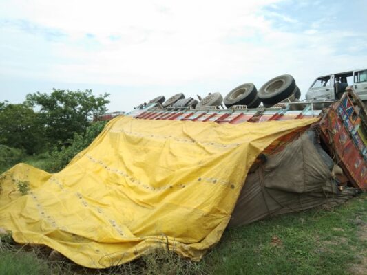 रात में मवेशियों को बचाने के चक्कर मैं पलटा ट्रक , चालक व हेल्पर घायल