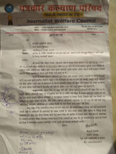 पत्रकार कल्याण परिषद का कहना है कि खनिज अधिकारी द्वारा हमारे पत्रकार साथी आशिफ खान प्रवीण पाल वाहिद खान पवन कुमार सोलंकी प्रदीप गांगुली धर्मेंद्र चौहान के साथ हुई अभद्रता एवं झूठी शिकायत जो की गई है यह सही नही है| इस पूरे मामले की निष्पक्ष जांच होना चाहिए इसके लिये हम सभी पत्रकार साथी प्रदेश के मुख्यमंत्री शिवराज सिंह चौहान से मांग करते हैं इस दौरान पत्रकार कल्याण परिषद के जिला उपाध्यक्ष वीरभान यादव सिद्धार्थ गुप्ता जितेंद्र तोमर हर्षित सिंह विनय पटैल सत्यम गुप्ता नीरज तिवारी सहित अन्य की उपस्थिति रही |