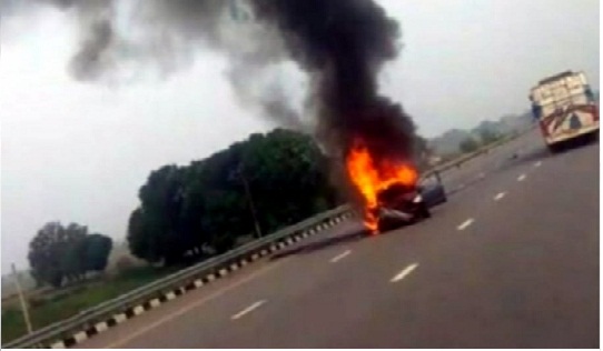 आगरा लखनऊ एक्सप्रेसवे पर डिवाइडर से टकराने के बाद कार में लगी आग
