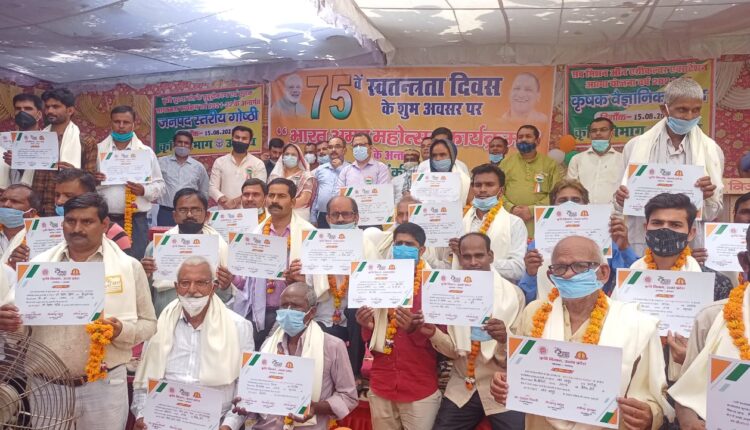 देश की आजादी का 75वा स्वतन्त्रता दिवस अमृत महोत्सव के रूप में मनाया गया। कार्यक्रम का शुभारम्भ जिला पंचायत अध्यक्षा शकुन सिंह एवं जिलाधिकारी रवीन्द्र कुमार ने दीप प्रज्वलित करके किया। महोत्सव में जनपद के उन्नतशील कृषक 16 कृषि के क्षेत्र में, 05 जैविक खेती करने वाले, 05 कृषक एफ0पी0ओ0ए0, 05 पशुपालक और 06 औद्यानिक फसलों की खेती करने कृषकों को अंग वस्त्र एव प्रमाण पत्र देकर सम्मानित किया गया।